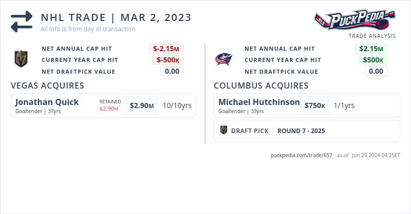 The Vegas Golden Knights acquired Jonathan Quick from the Columbus Blue Jackets for Michael Hutchinson and a 2025 7th round pick