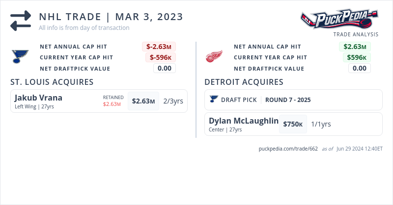 The St. Louis Blues acquired Jakub Vrana from the Detroit Red Wings for Dylan McLaughlin and a 2025 7th round pick