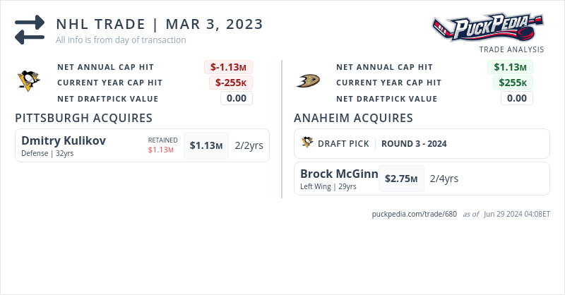 The Pittsburgh Penguins acquired Dmitry Kulikov from the Anaheim Ducks for a 2024 3rd round pick and Brock McGinn
