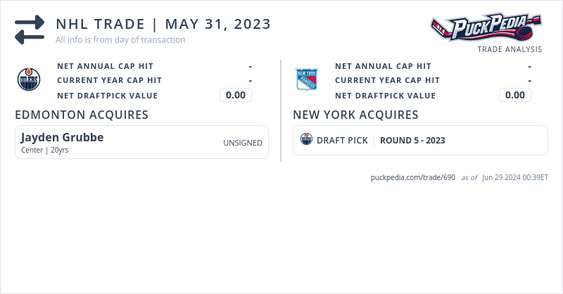 In the 2023 entry draft, the New York Rangers used this draft pick to select Rasmus Larsson in round 5, 152 overall.
