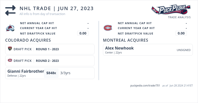 The Montreal Canadiens acquired Alex Newhook from the Colorado Avalanche for a 2023 1st round pick (#31), 2023 2nd round pick (#37), and Gianni Fairbrother