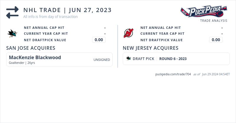 The San Jose Sharks acquired MacKenzie Blackwood from the New Jersey Devils for a 2023 6th round pick (#164)