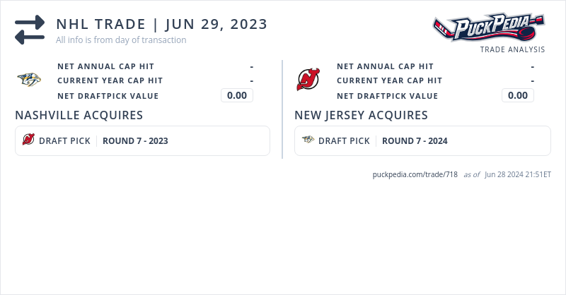 The Nashville Predators acquired a 2023 7th round pick (#218) from the New Jersey Devils for a 2024 7th round pick