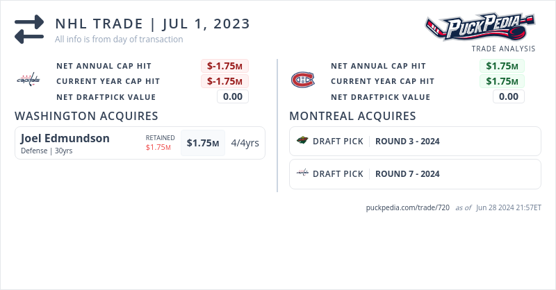 The Washington Capitals acquired Joel Edmundson from the Montreal Canadiens for a 2024 3rd round pick and 2024 7th round pick