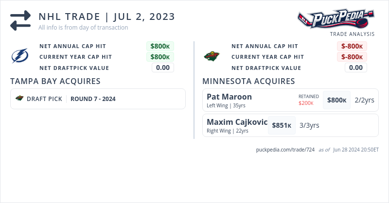 The Minnesota Wild acquired Patrick Maroon and Maxim Cajkovic from the Tampa Bay Lightning for 2024 7th Round Pick