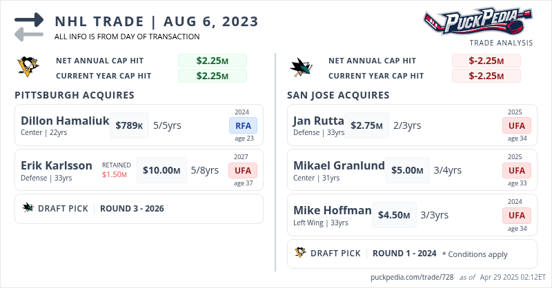 The Pittsburgh Penguins acquired Erik Karlsson, Dillon Hamaliuk and 2026 3rd Round Pick from the San Jose Sharks for Mikael Granlund, Mike Hoffman, Jan Rutta and 2024 1st round pick (top 10 protected)