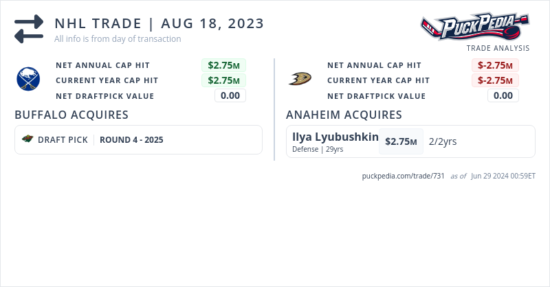 In the 2025 entry draft, the Buffalo Sabres used this draft pick to select Samuel Meloche in round 4, 116 overall.