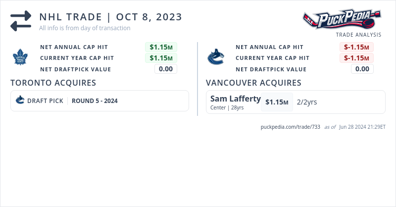 In the 2024 entry draft, the Toronto Maple Leafs used this draft pick to select Timofei Obvintsev in round 5, 157 overall.