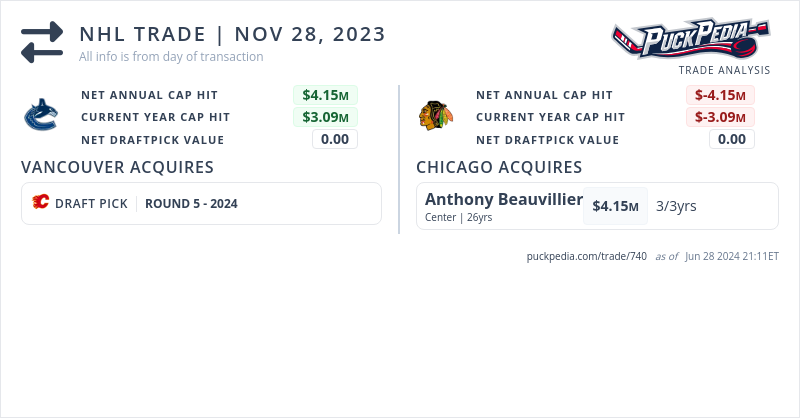 The Chicago Blackhawks acquired Anthony Beauvillier from the Vancouver Canucks for 2024 5th round pick