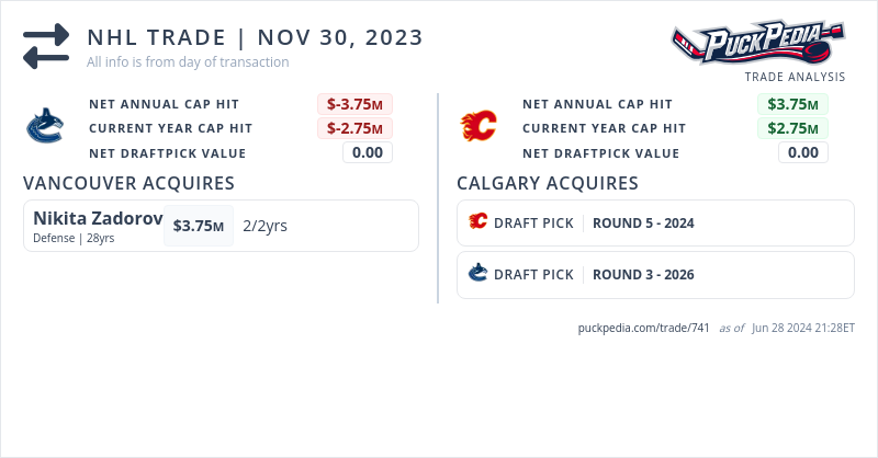 The Vancouver Canucks acquired Nikita Zadorov from the Calgary Flames for a 2024 5th round pick and 2026 3rd round pick