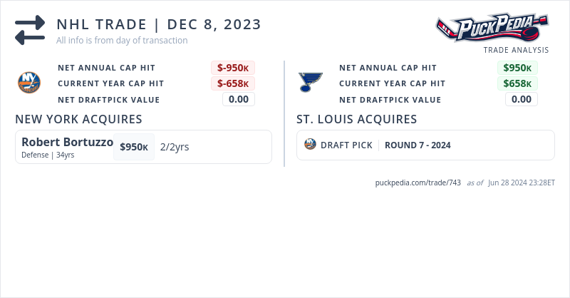 The New York Islanders acquired Robert Bortuzzo from the St. Louis Blues for a 2024 seventh round pick