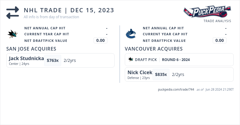 The San Jose Sharks acquired Jack Studnicka from the Vancouver Canucks for Nick Cicek and a 2024 6th round pick