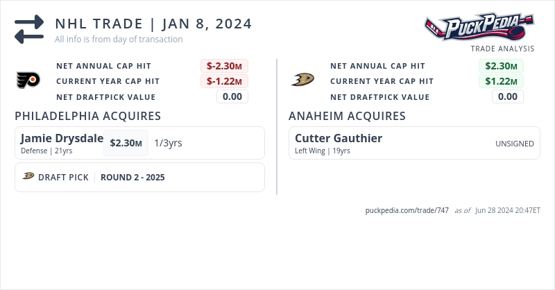 The Anaheim Ducks acquired Cutter Gauthier from the Philadelphia Flyers for Jamie Drysdale and 2025 second round pick
