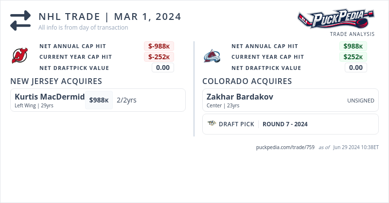 The New Jersey Devils acquired Kurtis MacDermid from the Colorado Avalanche for a 2024 7th round pick and Zakhar Bardakov