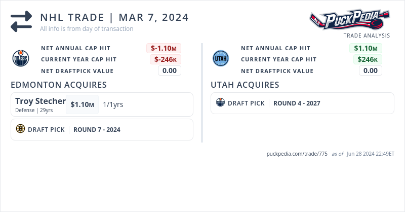 The Edmonton Oilers acquired Troy Stecher and a 2024 7th round pick from the Arizona Coyotes for a 2027 4th round pick