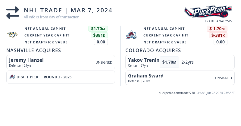 The Colorado Avalanche acquired Yakov Trenin and Graham Sward from the Nashville Predators for Jeremy Hanzel and 2025 3rd Round Pick
