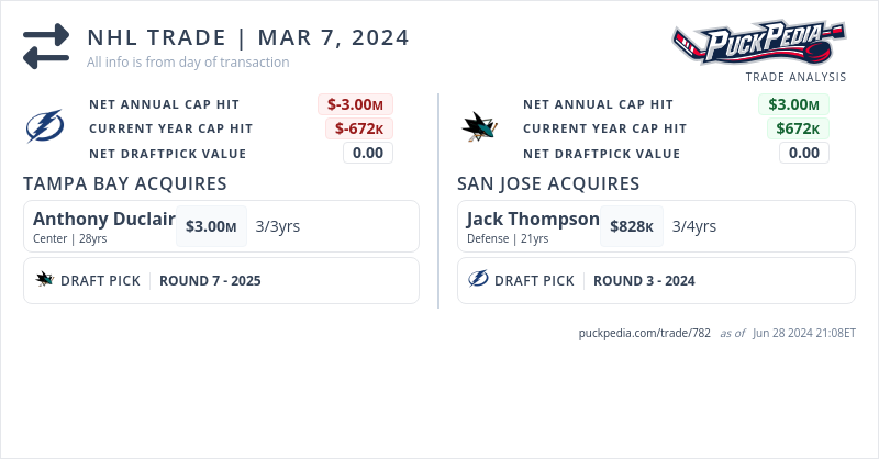 The Tampa Bay Lightning acquired Anthony Duclair and 2025 7th round pick from the San Jose Sharks for Jack Thompson and 2024 3rd round pick