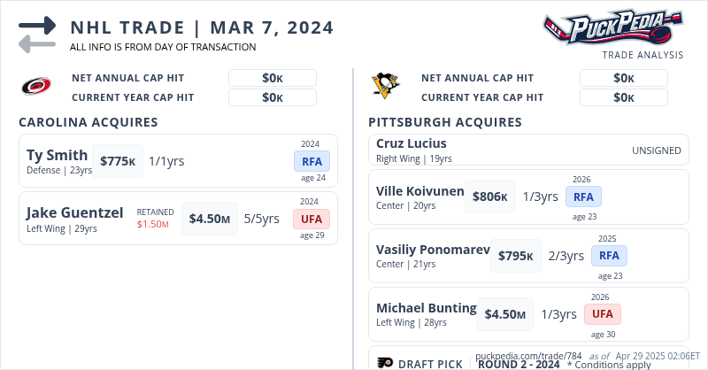The Carolina Hurricanes acquired Jake Guentzel from the Pittsburgh Penguins for Michael Bunting, Vasiliy Ponomarev, Ville Koivunen, Cruz Lucius, a conditional 2024 2nd round pick, and a conditional 2024 5th round pick (condition not met)