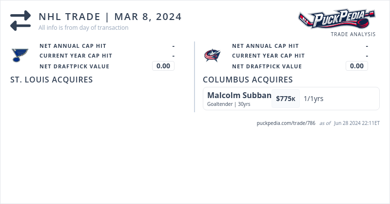 The Columbus Blue Jackets acquired Malcolm Subban from the St. Louis Blues for future considerations.