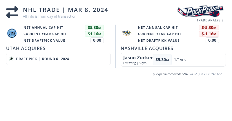 The Nashville Predators acquired Jason Zucker from the Arizona Coyotes for a 2024 6th round pick