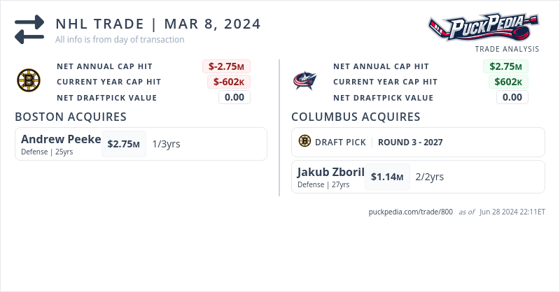 The Boston Bruins acquired Andrew Peeke from the Columbus Blue Jackets for a 2027 3rd round pick and Jakub Zboril