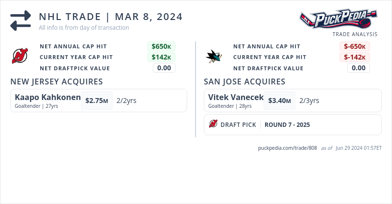 The New Jersey Devils acquired Kaapo Kahkonen from the San Jose Sharks for Vitek Vanecek and 2025 7th round pick
