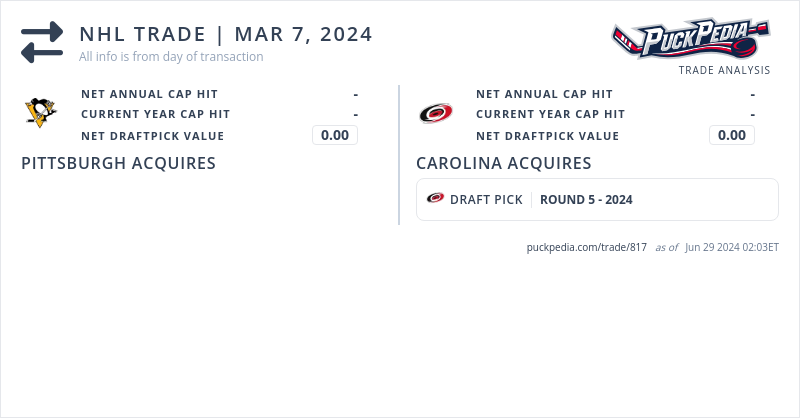 Jake Guentzel trade, conditional 2024 5th Round Pick transfers from Carolina to Pittsburgh if Carolina wins 2024 cup: Condition not met