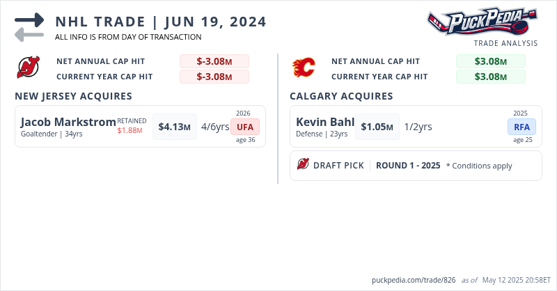 The New Jersey Devils acquired Jacob Markstrom from the Calgary Flames for Kevin Bahl and a 2025 1st round pick