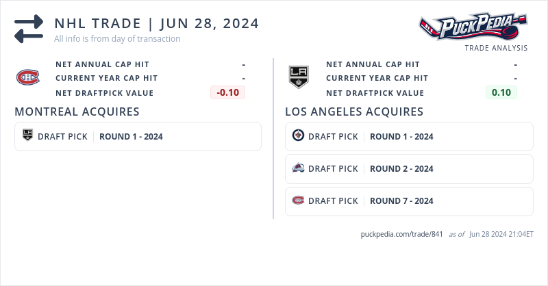The Montreal Canadiens acquired a 2024 1st round pick (#21) from the Los Angeles Kings for a 2024 1st round pick (#26), 2024 2nd round pick (#57) and 2024 7th round pick (#198)