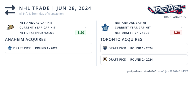 The Anaheim Ducks acquired a 2024 1st round pick (#23) from the Toronto Maple Leafs for a 2024 1st round pick (#31) and a 2024 2nd round pick (#58)