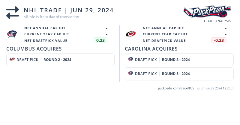 The Columbus Blue Jackets acquired a 2024 2nd round pick (#60) from the Carolina Hurricanes for a 2024 3rd round pick (#69) and 2024 5th round pick (#133)