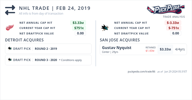 San Jose Sharks acquired Gustav Nyquist from Detroit Red Wings for 2019 2nd Round Pick & Conditional 2020 3rd Round Pick.