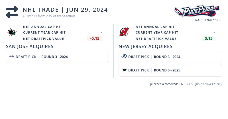 The San Jose Sharks acquired a 2024 3rd round pick (#82) from the New Jersey Devils for a 2024 3rd round pick (#85) and 2025 6th round pick