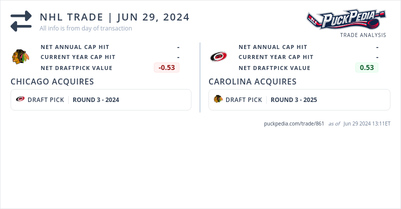The Chicago Blackhawks acquired a 2024 3rd round pick from the Carolina Hurricanes for a 2025 3rd round pick