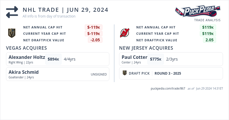 The Vegas Golden Knights acquired Alexander Holtz and Akira Schmid from the New Jersey Devils for Paul Cotter and a 2025 3rd round pick