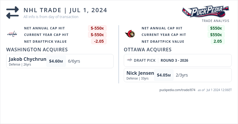 The Washington Capitals acquired Jakob Chychrun from the Ottawa Senators for Nick Jensen and a 2026 3rd round pick