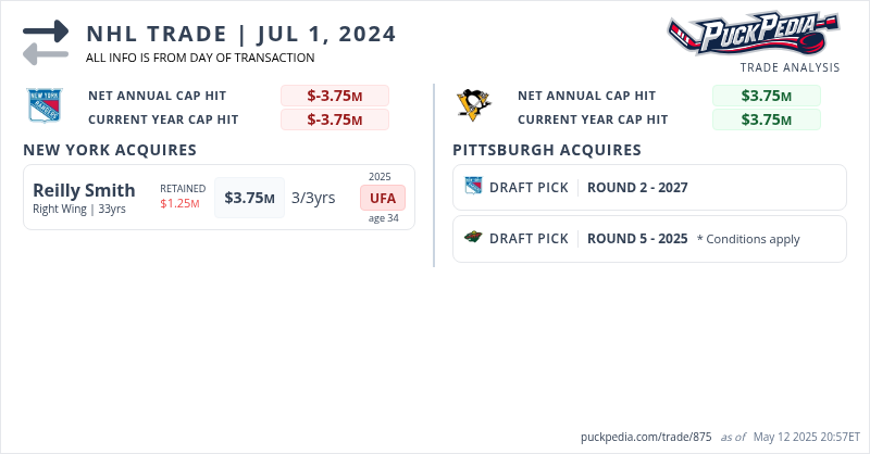 The New York Rangers acquired Reilly Smith from the Pittsburgh Penguins for a 2027 2nd round pick and conditional 2025 5th round pick