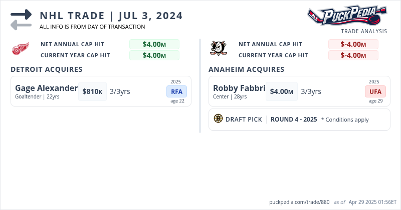 The Anaheim Ducks acquired Robby Fabbri and a 2025 conditional 4th Round Pick from the Detroit Red Wings for Gage Alexander
