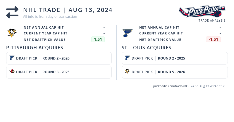 The St. Louis Blues acquired 2025 2nd Round Pick and 2026 5th Round Pick from the Pittsburgh Penguins for 2026 2nd Round Pick and 2025 3rd Round Pick