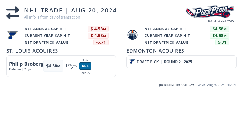 The St. Louis Blues acquired Philip Broberg from the Edmonton Oilers for a 2025 2nd round pick as offer sheet compensation