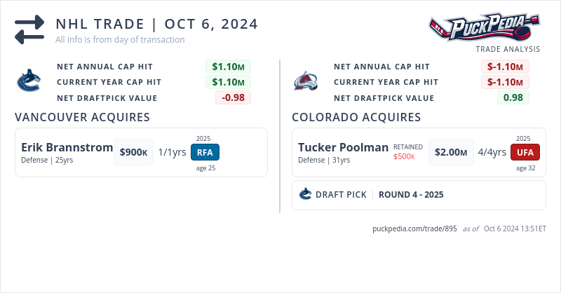 The Vancouver Canucks acquired Erik Brannstrom from the Colorado Avalanche for Tucker Poolman and 2025 4th Round Pick
