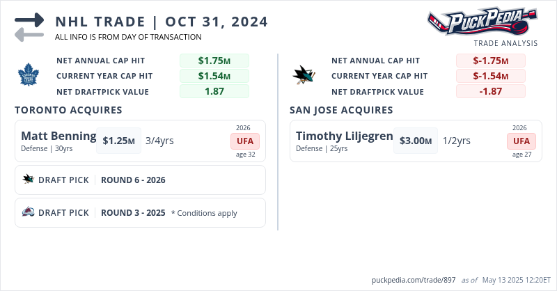 The San Jose Sharks acquired Timothy Liljegren from the Toronto Maple Leafs for Matt Benning, a 2026 6th round pick and a Conditional 2025 3rd round pick