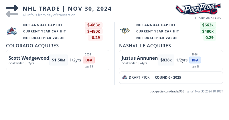 The Colorado Avalanche acquired Scott Wedgewood from the Nashville Predators for Justus Annunen and 2025 6th Round Pick