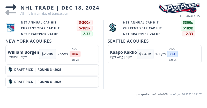 The Seattle Kraken acquired Kaapo Kakko from the New York Rangers for William Borgen, a 2025 3rd round pick and a 2025 6th round pick