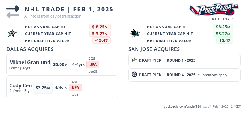 The Dallas Stars acquired Mikael Granlund and Cody Ceci from the San Jose Sharks for a 2025 1st round pick and conditional 2025 4th round pick