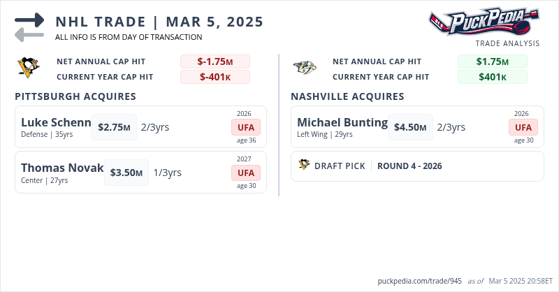 The Pittsburgh Penguins acquired Luke Schenn and Thomas Novak from the Nashville Predators for Michael Bunting and a 2026 4th round pick
