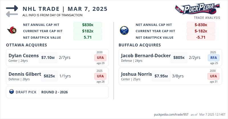 The Buffalo Sabres acquired Josh Norris and Jacob Bernard-Docker from the Ottawa Senators for Dylan Cozens, Dennis Gilbert, and a 2026 2nd round pick