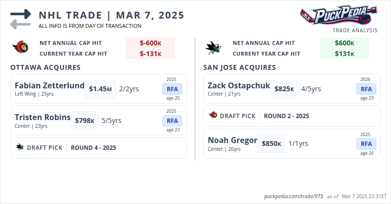 The Ottawa Senators acquired Fabian Zetterlund, Tristen Robins and a 4th round pick from the San Jose Sharks for Zack Ostapchuk, Noah Gregor and a 2025 2nd round pick