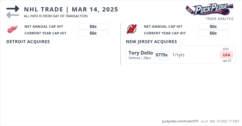 The New Jersey Devils acquired Tory Dello from the Detroit Red Wings for future considerations