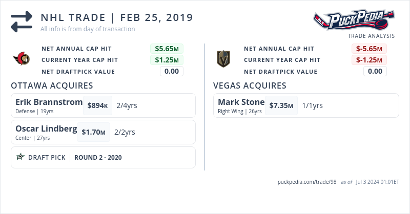 Vegas Golden Knights acquire Mark Stone from Ottawa Senators for Erik Brannstrom, Oscar Lindberg & Dallas Stars 2020 2nd Round Pick